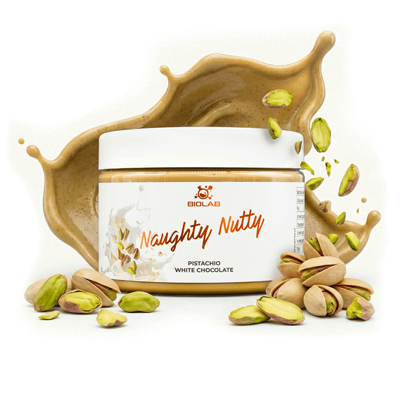 Die Kombination aus Pistazien und weißer Schokolade mit niedrigem glykämischen Index. Pistazien sind reich an Antioxidantien, die den Organismus im Kampf gegen freie Radikale unterstützen.