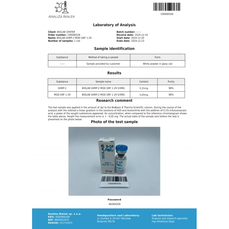 Modifiziertes GRF ist ein verkürztes Peptidanalogon des Wachstumshormon-Releasing-Hormons (GHRH). Wissenschaftliche Studien mit modGRF, das erstmals in den 1980er Jahren entwickelt wurde, haben gezeigt, dass es die Muskelreparatur und das Muskelwachstum verbessert, die Wundheilung beschleunigt, die Knochen stärkt, die Fettverbrennung erhöht und den Stoffwechsel verbessert. Es kann auch positive Auswirkungen auf die Blutzuckerregulierung und das Immunsystem haben.